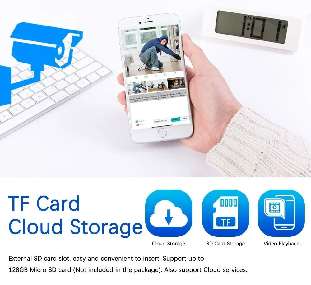 The camera supports up to 128GB TF card local backup and also provides cloud storage service(Need to pay extra cost)
