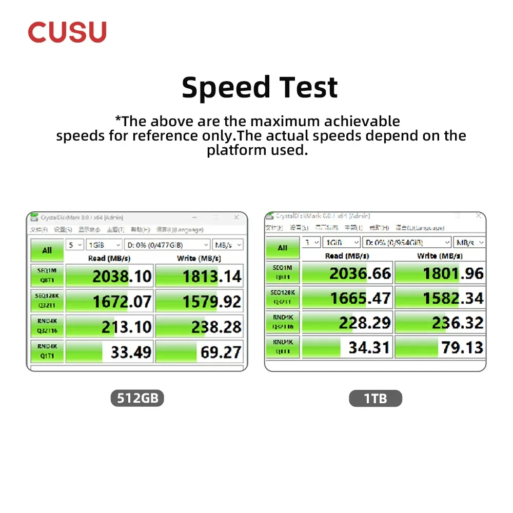 In our description, the speed is just for your reference, SSD speed will be influenced by many factors, such as interface type, computer hardware grade, computer system, and test system.