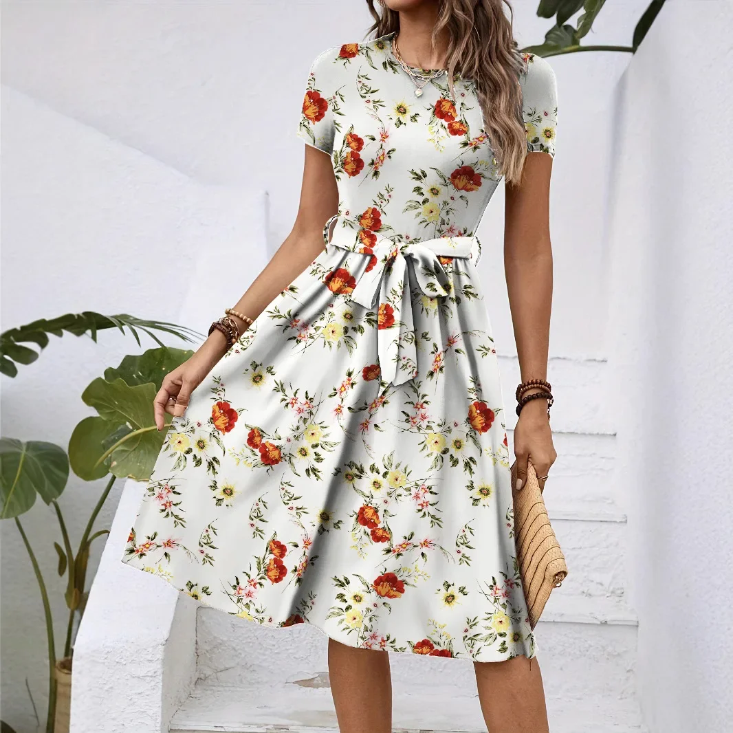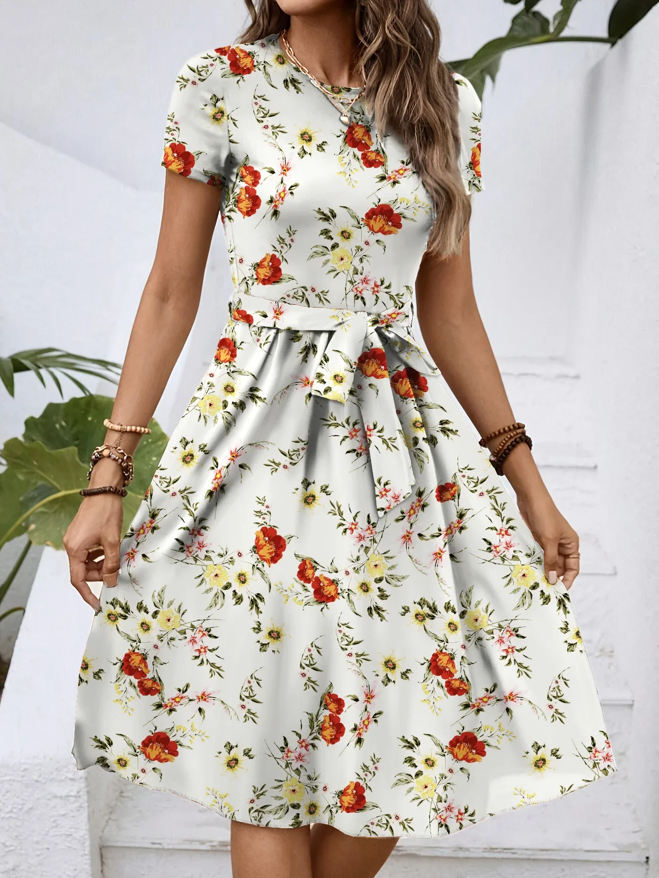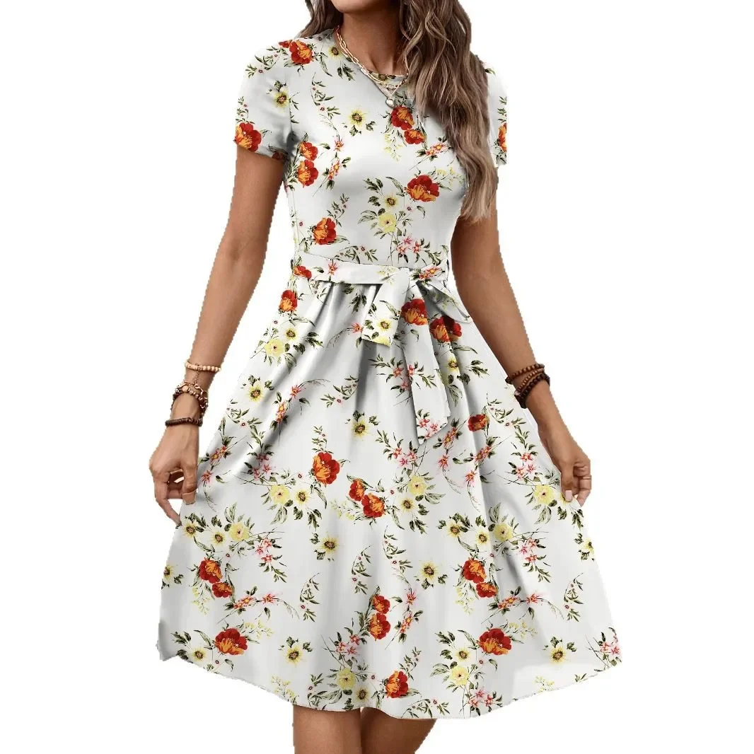 Dresses Women Flower Print Dress Round Collar Short Sleeve Lace Up Tight Waist Vestidos Casual Knee Length A Line 2025 Summer